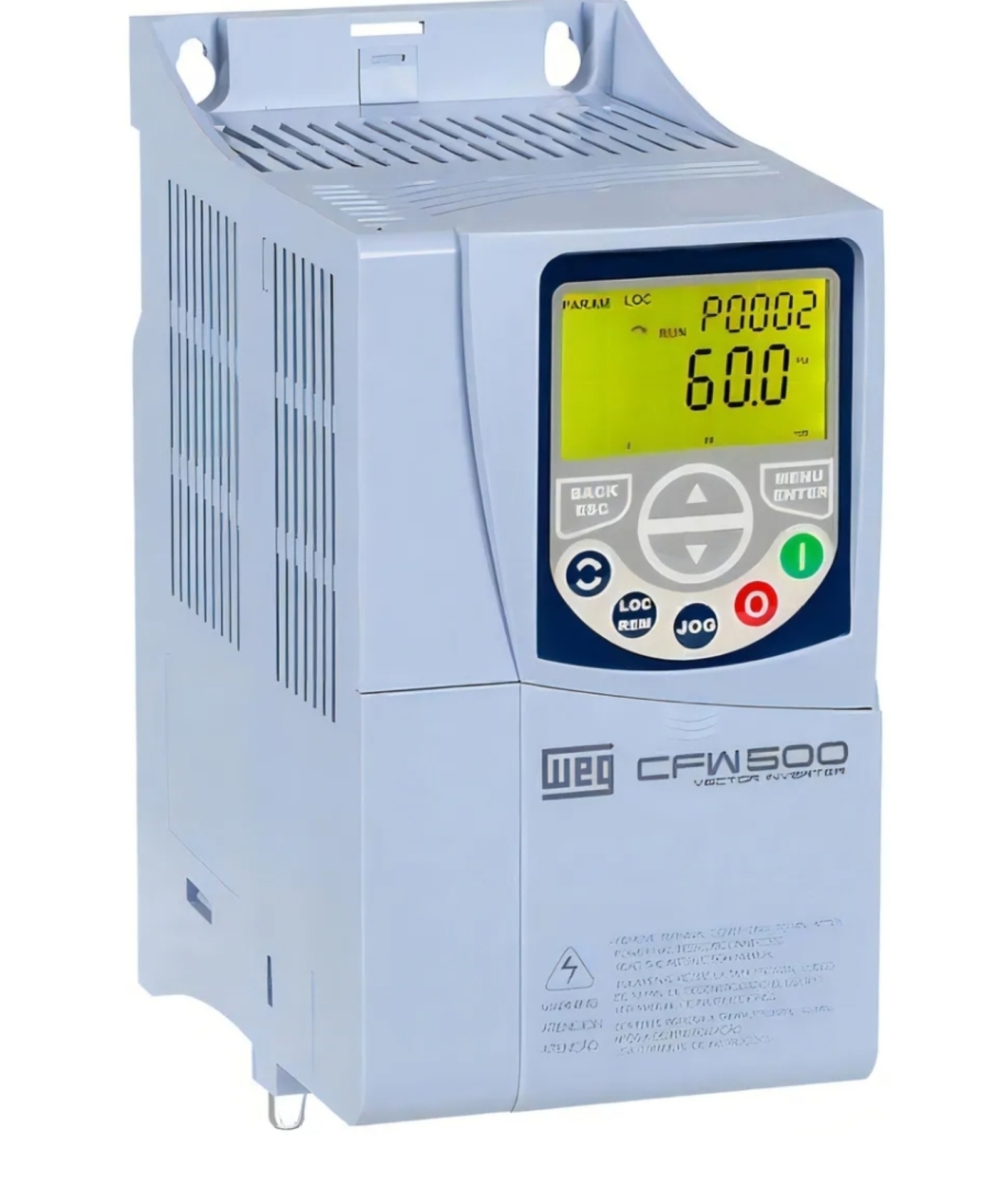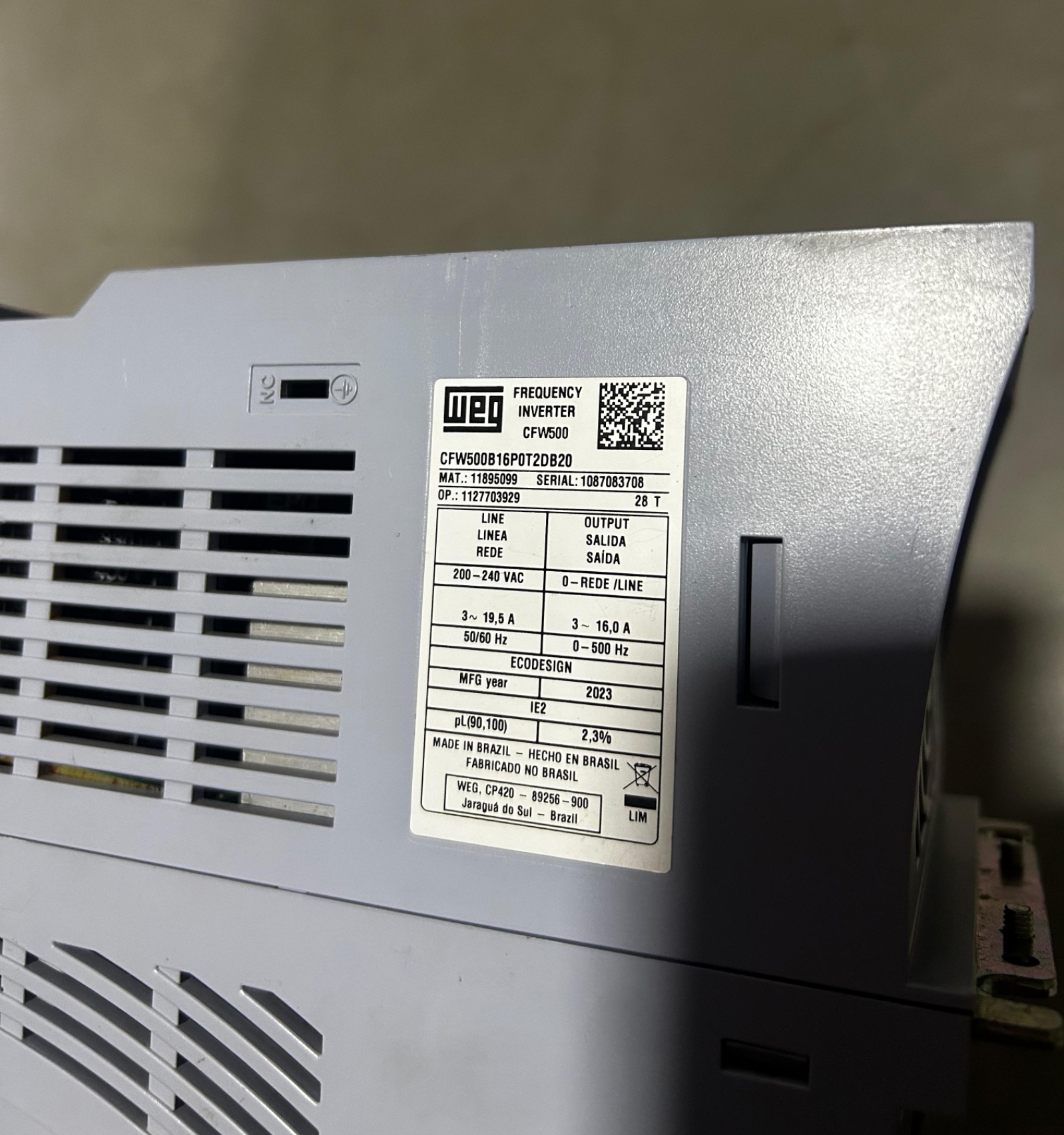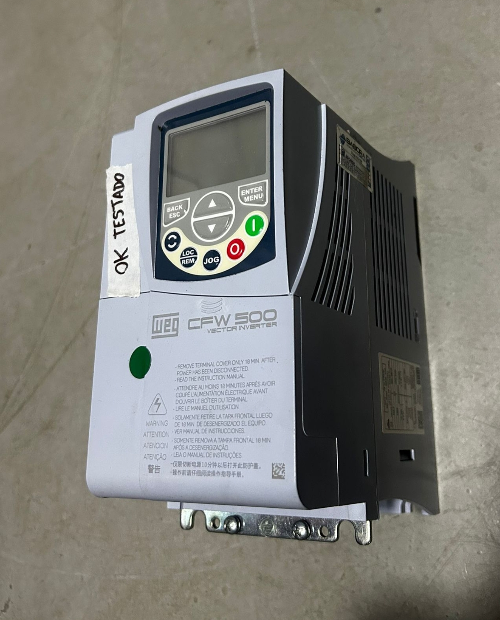 Inversor de frequência WEG linha CFW500, modelo CFW500B16P0T2DB20, potência 2CV (1,5kW), alimentação 220V trifásico. Controle vetorial, ideal para acionamento de motores em aplicações industriais como bombas, esteiras e ventiladores. Possui teclado e display frontal.